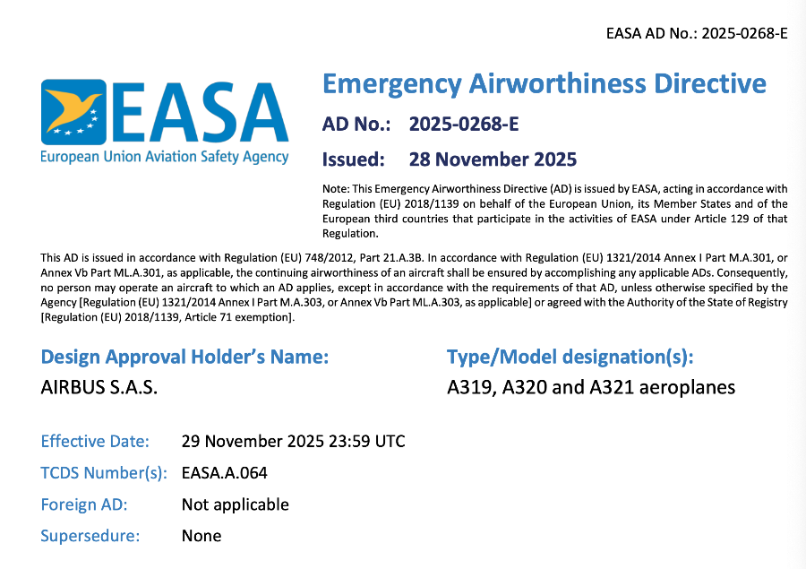 法国当地时间11月28日,欧盟航空安全局EASA颁布紧急适航指令,要求立即停飞所有的涉及的空客320飞机。
