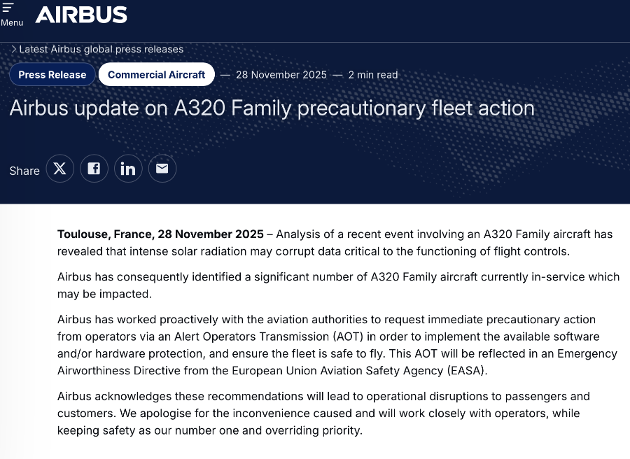 空客11月28日也发布一份声明,解释了一下此事由来,指出空客A320飞机需要紧急更换一种易受太阳辐射影响的飞行控制软件,强烈的太阳辐射可能损坏飞行控制所需的关键数据,并确认目前有大量服役中的A320系列飞机可能受到影响。空客因此主动联系航空管理机构,要求航司立即采取预防措施,实施现有软件和/或硬件防护方案,确保机队飞行安全。该通报内容将被纳入欧盟航空安全局发布的紧急适航指令。