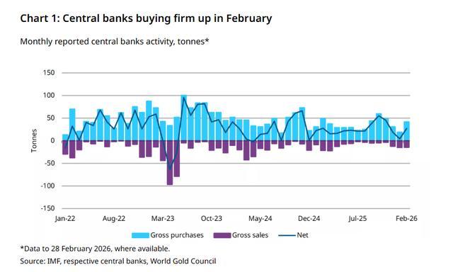 世界黄金协会(World Gold Council)4月2日发布的最新央行黄金统计报告显示,2026年2月全球央行净购金27吨,较1月的低迷明显回升,与2025年全年月均26吨的水平基本吻合。今年前两个月累计净购金31吨,但低于去年同期的50吨。