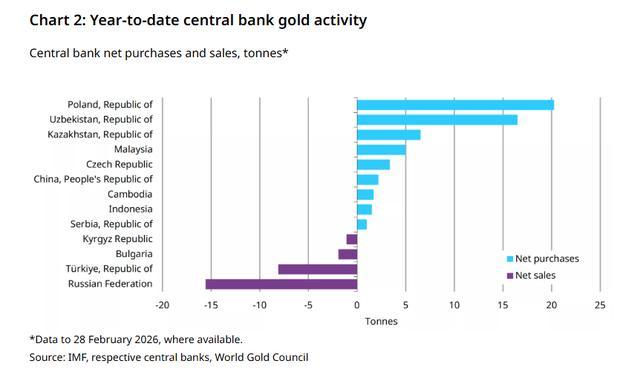 波兰国家银行2月购入20吨,为2025年2月(29吨)以来的最大单月购入量,其黄金储备总量升至570吨,占总储备比例达31%。
