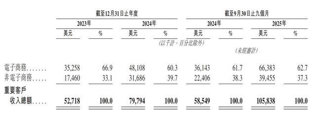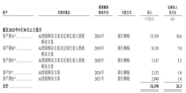 2023年、2024年及2025年前9个月,钛动来自前五大客户的合计收入分别为2890万美元、3750万美元及3420万美元,分别占其总收入的39.8%、36.7%及26.3%。
