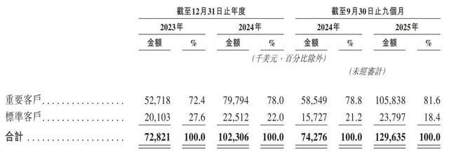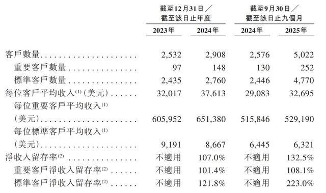 2025年前9个月,钛动科技总客户数达到5022个,其中重要客户数达到252个,为一整个财政年度收入贡献超过10万美元,或在截至2024年及2025年9月30日止九个月按比例贡献超过7.5万美元的客户;标准客户数达到4770个,为年度支出水平较低的客户。