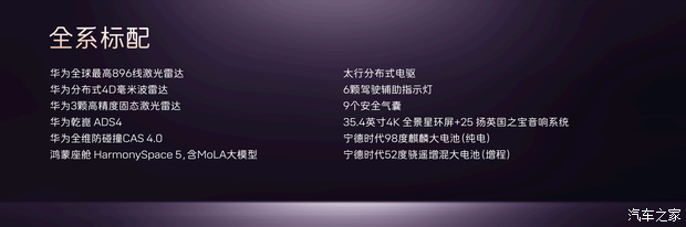 新车依旧会提供增程以及纯电动力,其中增程版车型搭载1.5T增程器,最大功率115千瓦,采用后置双电机布局,单个电机最大功率为200kW;纯电动版提供四驱和后驱版本,其中后驱车型采用后置双电机布局,单个电机最大功率为251kW,四驱版车型则会在此基础上增加210kW的前置单电机。续航方面,增程版车型依旧搭载52.01kWh电池,纯电续航里程调整为261km;纯电动版车型则会升级为98.07kWh电池,分别提供735km、670km和605km三种续航里程,0-100km/h加速最快2.71秒,新车还提升了舒适性,降低眩晕感,车辆减速降低86%。纯电车型还升级搭载宁德时代6C麒麟超充电池,38%-80%仅需10分钟。另外,新车还新增前排中央气囊。